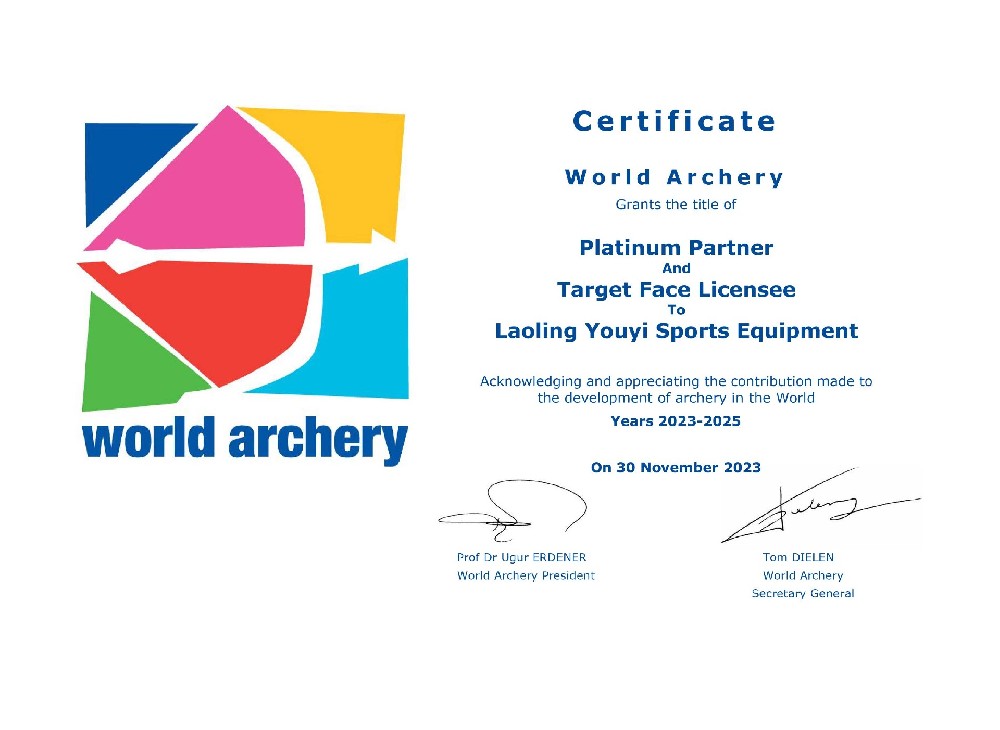 目前,主要生產(chǎn)和銷售射箭比賽及訓(xùn)練專用器材,包括:箭靶、靶紙、靶架、號(hào)碼牌、風(fēng)向旗、計(jì)時(shí)記分器等場地器材設(shè)備;反曲弓、復(fù)合弓、傳統(tǒng)弓、瞄準(zhǔn)器、防震桿等弓箭裝備;箭壺、護(hù)胸、護(hù)臂、護(hù)指等各類箱包護(hù)具。公司所生產(chǎn)的射箭器材已通過國際射箭聯(lián)合會(huì)及中國射箭協(xié)會(huì)CAA認(rèn)證。